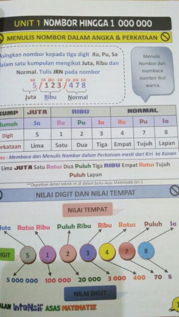 Sebagai contoh, nilai bagi setiap angka dalam nombor 4,128,925 adalah seperti berikut;. 2798 ribu ratus 2 7 puluh 6 sa 5 2.